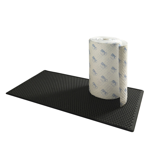 SA-AFO is a 2-ply, white, heavy-duty, welded, and perforated oil-absorbent roll (76 cm × 46 m, perforated every 76 cm) that absorbs oil and petroleum-based liquids. It also features a low-impact nitrile rubber mat (82 cm × 152 cm). The combination of a rubber base and an absorbent mat protects feet, legs, and back. Silicone-free, it is suitable for use in vehicle paint shops. The high-quality nitrile rubber makes the low-impact mat oil-resistant. It protects employees and the floor from oils and other industrial liquids.