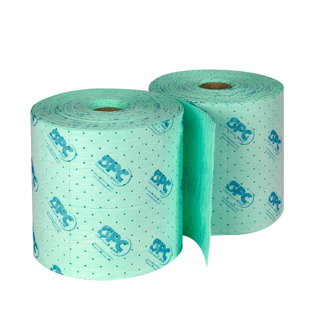 2-ply, green, medium-weight, welded, and double-perforated chemical absorbent rolls for absorbing chemicals and hazardous liquids. The single-sided spunbonded top layer provides added strength and reduces linting. It won't disintegrate or cause a dangerous chemical reaction with the absorbed liquid. The green color alerts employees that the product is used for hazardous liquids. It also facilitates the identification, separation, and disposal of hazardous waste, reducing disposal costs. Center and cross-cut perforations allow for the exact amount of material needed, reducing waste. Perfect for cleaning up chemical spills or for use in laboratories.