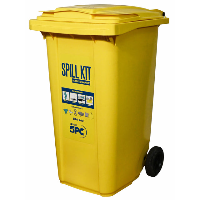 Le SKA-240 est un chariot d'urgence sur roulettes, logé dans un conteneur en polyéthylène avec couvercle à charnière. Il est conçu pour les déversements importants de liquides industriels tels que les huiles, l'eau, les liquides de refroidissement et les solvants. Ce conteneur résistant aux intempéries protège les absorbants de la saleté, de l'humidité et des dommages. Le couvercle à charnière facilite l'accès aux produits. Les roulettes offrent une excellente mobilité, en intérieur comme en extérieur.