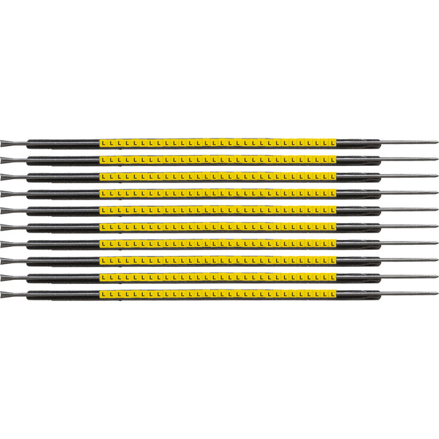 Die Clip Sleeve™ Drahtmarkierer lassen sich mit dem mitgelieferten Quik-Wand™ Spezialmontagestab schnell und einfach anbringen. Halten Sie das geweitete Ende des Montagestabs an den Draht und schieben Sie den Clip auf den Draht. Die Clips mit Zickzacksp